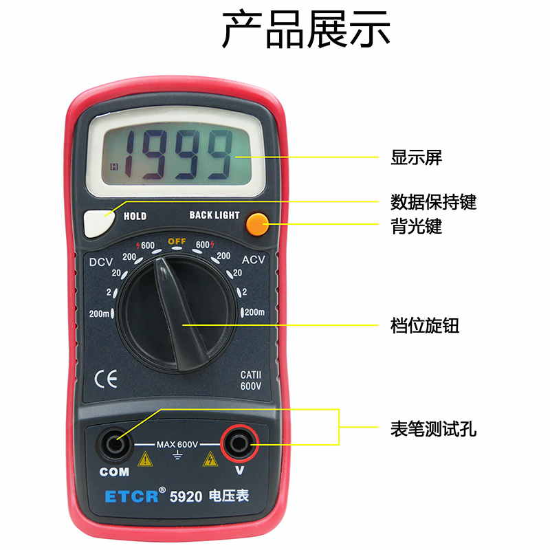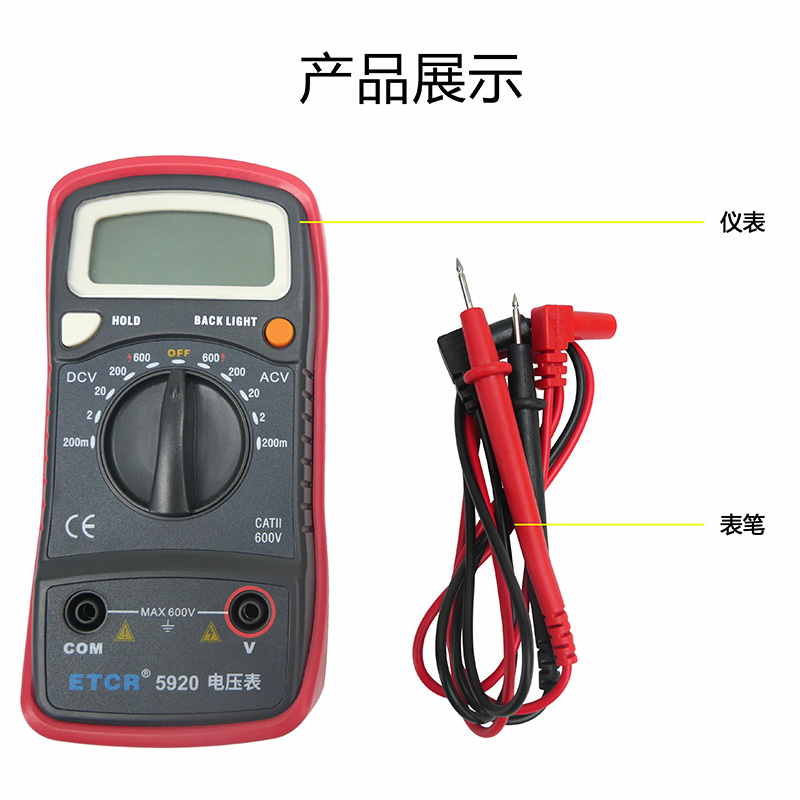 ETCR5920數(shù)字電壓表設(shè)有背光源,方便用戶在黑暗的場(chǎng)所讀出測(cè)量值。