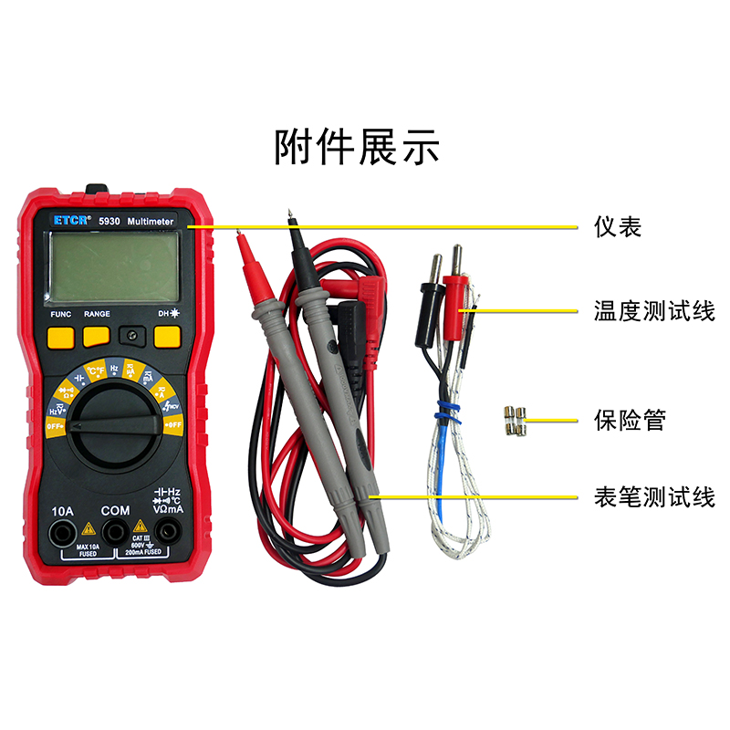 | ETCR5930數字萬用表 | DC 0.0mV~600V AC 0mV~600V | DC 0.0uA~10A AC 0.0uA~200mA | 0.0Ω~20MΩ | 0.0nF~2mF | 0.0Hz~20MHz | 0℃~1000℃ |
