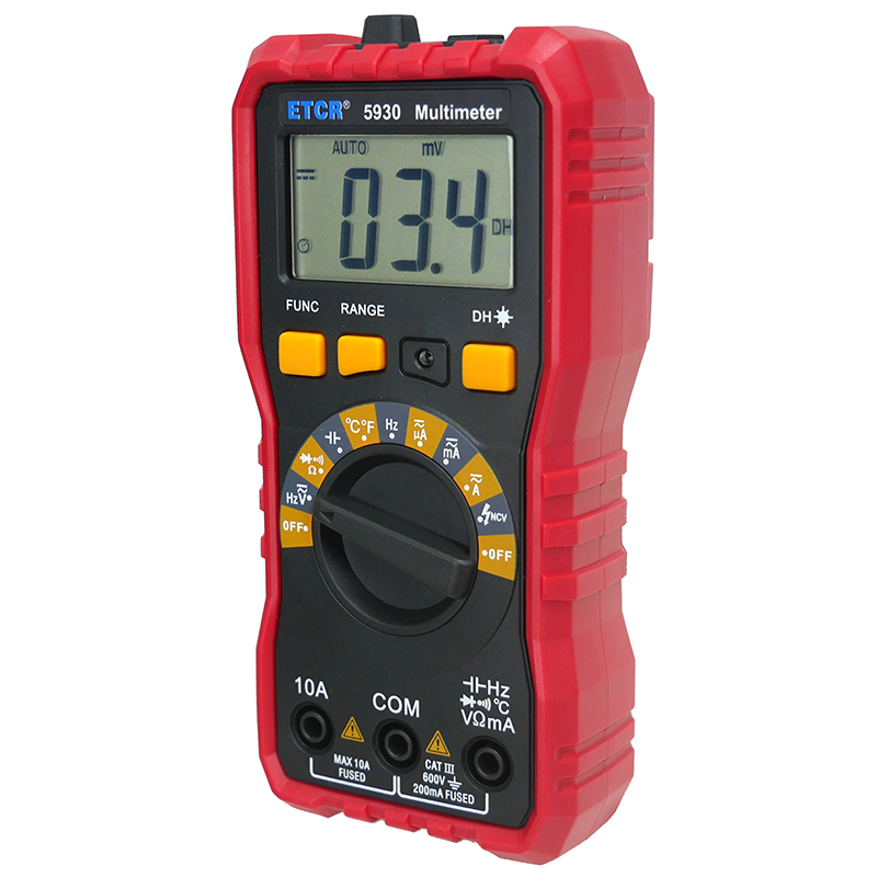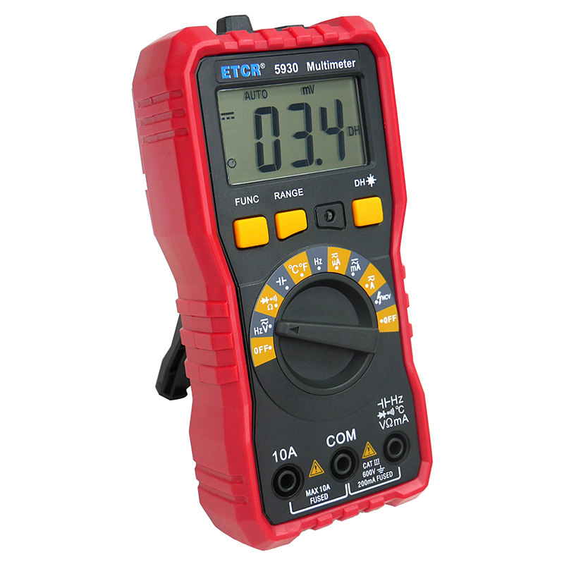 ETCR5930數字萬用表又稱數字萬能表、智能萬用表,是一款3 1/2位便攜式自動量程數字多用表,可測量交流電壓真有效值(TRMS)、直流電壓、交流電流真有效值(TRMS)、直流電流、電阻、頻率、電容、溫度、通斷測試、二極管正向壓降等。該儀表結構精巧、操作容易、攜帶方便,是電工電子測量之理想工具。