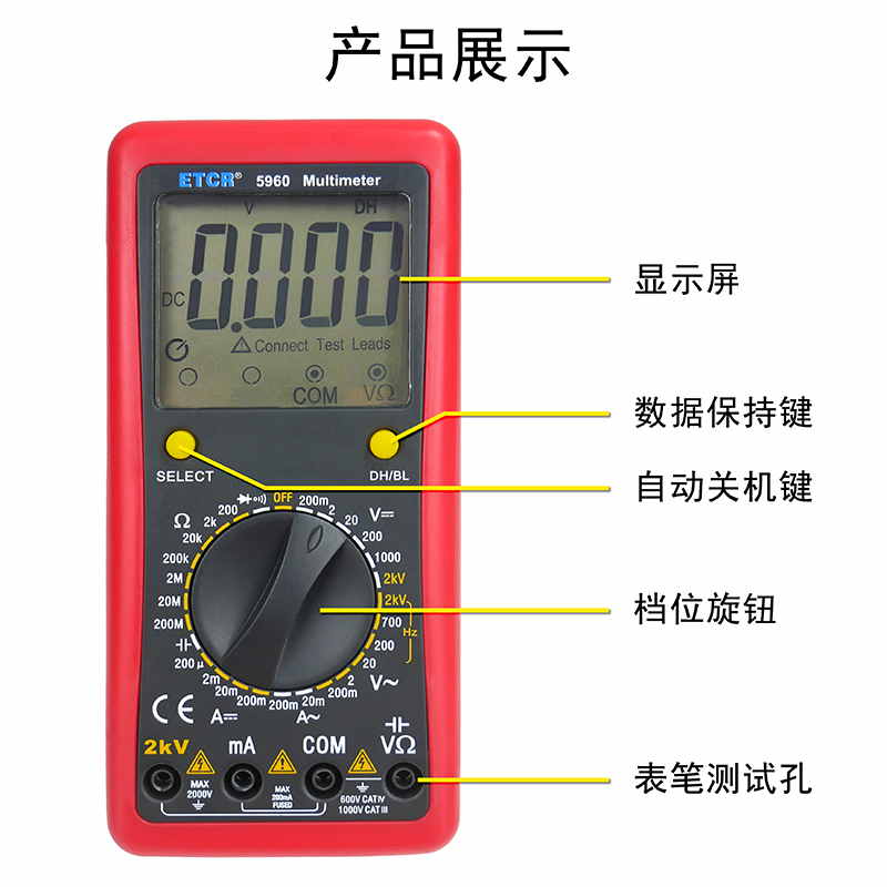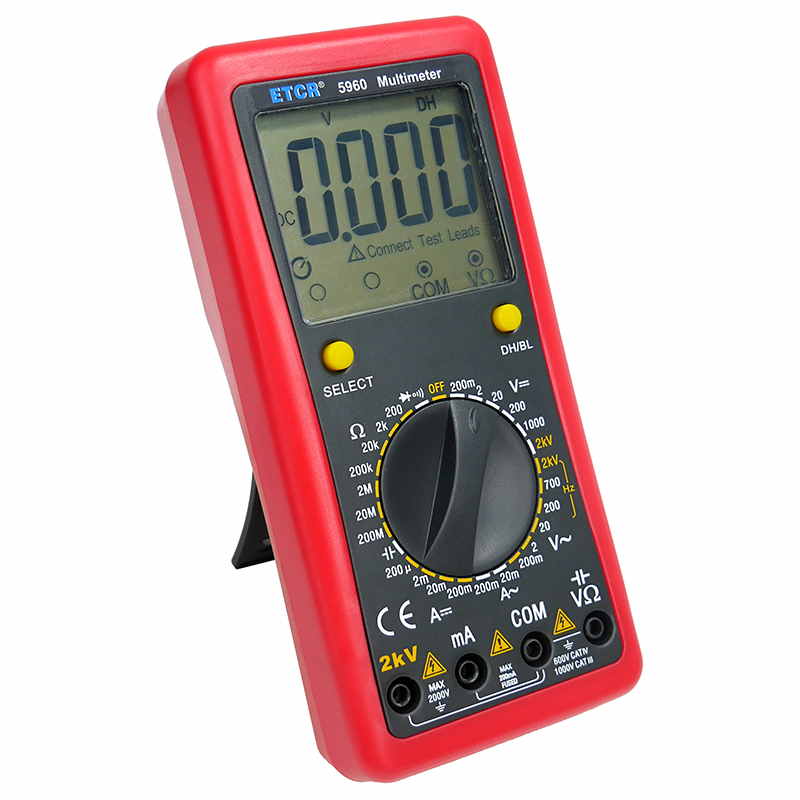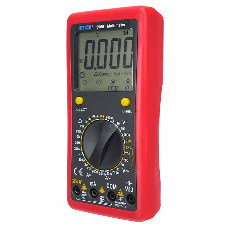 ETCR5960數(shù)字萬用表又稱數(shù)字萬能表、智能萬用表,是一種性能穩(wěn)定、用電池供電的高可靠性數(shù)字萬用表,它用單片機管理,全功能有過載保護(hù)。儀表能顯示各檔表筆和插座應(yīng)插的位置,提示您不要插錯位置。該儀表能測量直流電壓和電流、交流真有效值電壓和電流、電阻、電容、二極管正向壓降、電路通斷等。測量準(zhǔn)確、性能穩(wěn)定、安全可靠,是您理想的測試維修工具!