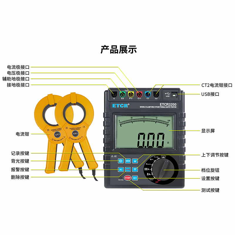 | ETCR3200C 雙鉗接地電阻測試儀 | Φ70mm | 0.00Ω~300kΩ | AC 0V~100V | 0.0mA~600A | 可設(shè)置報警閾值 | 2000組 |