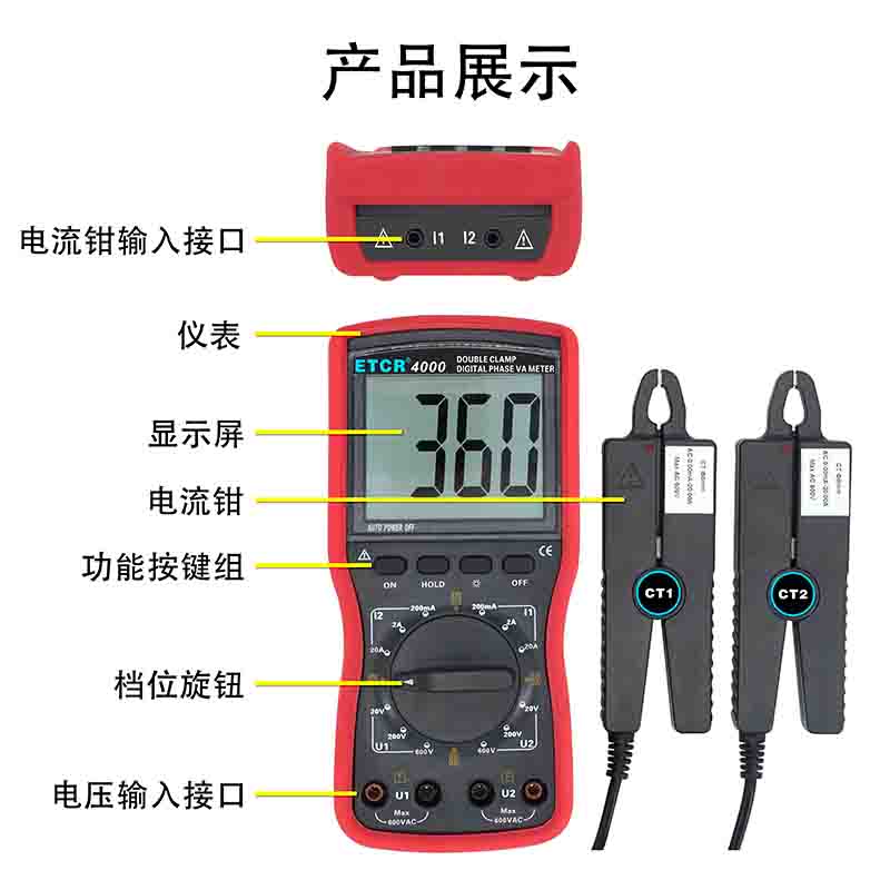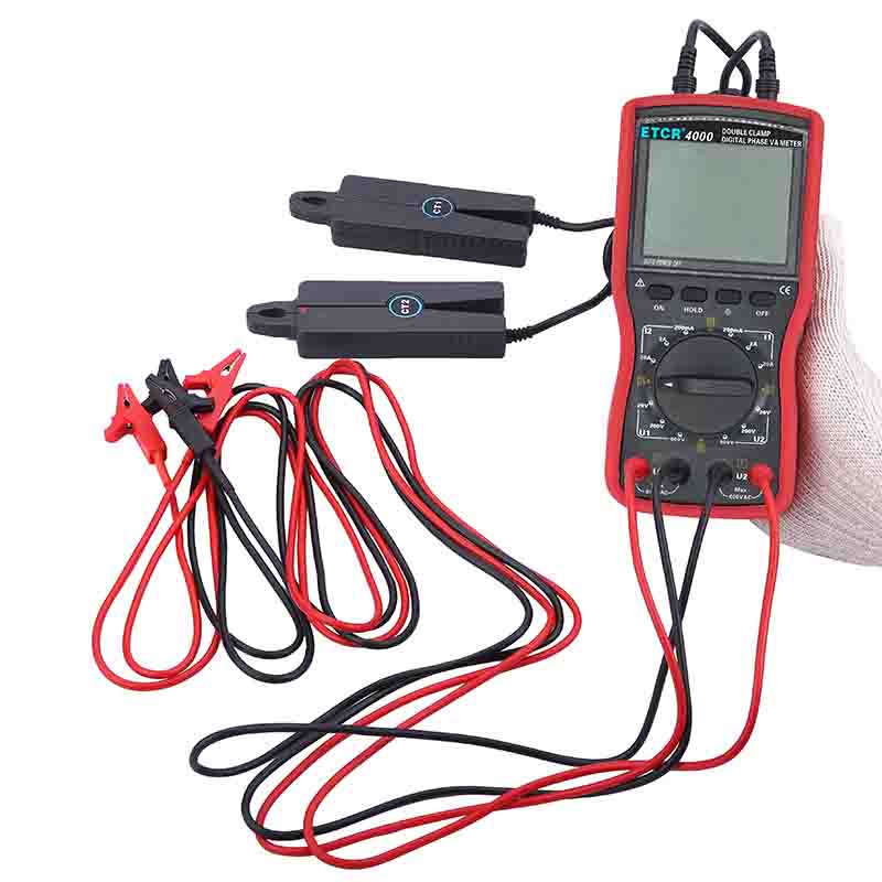 ETCR4000雙鉗數字相位伏安表采用超大LCD顯示屏,白屏背光,顯示一目了然,儀表采用絕緣防滑護套,具有數據保持功能,自動關機功能,操作簡單,可靠耐用。