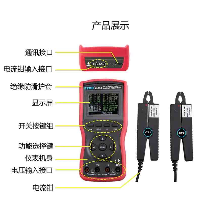 ETCR4000A智能型雙鉗數(shù)字相位伏安表又稱(chēng)單相相位伏安表、數(shù)字相位伏安表、伏安相位儀、相位測(cè)量?jī)x,用于測(cè)量?jī)陕方涣麟妷?、電流、電壓間相位、電流間相位、電壓電流間相位、頻率、相序、有功功率、無(wú)功功率、視在功率、功率因數(shù)等,判別變壓器接線組別、感性、容性電路,測(cè)試二次回路和母差保護(hù)系統(tǒng),讀出差動(dòng)保護(hù)各組CT之間的相位關(guān)系,檢查電度表的接線正確與否,檢修線路設(shè)備等,為用電檢查人員提供一種安全、準(zhǔn)確、便捷的新型電力儀表。尤其適用于電能計(jì)費(fèi)系統(tǒng)及繼電保護(hù)系統(tǒng),其供電營(yíng)銷(xiāo)部門(mén)的電能計(jì)量、用電檢查、電力稽查,生技部門(mén)的裝表接電 、繼電保護(hù)、差動(dòng)檢測(cè)、啟動(dòng)試驗(yàn)、變電檢修,或電力實(shí)訓(xùn)、技能比武等。