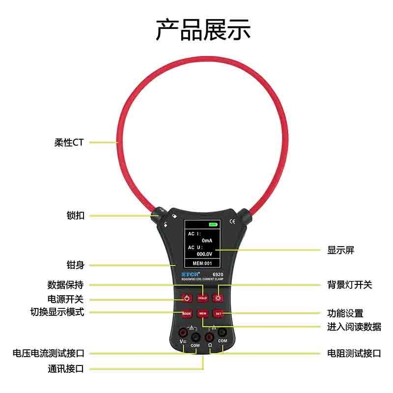 ETCR6920柔性電流鉗表又名柔性線圈鉗表、超大電流鉗表、羅氏線圈電流鉗表、洛氏線圈電流鉗表,用于交流電流測試、電壓測試、電阻測試、通斷測試。柔性線圈無任何裸露金屬導(dǎo)體,體積小、重量輕、柔軟靈活,特別適合大尺寸導(dǎo)體、狹窄環(huán)境和排線密集的場所,可用于信號(hào)嚴(yán)重畸變的工業(yè)環(huán)境電流測試。廣泛適用于電力、通信、氣象、鐵路、油田、建筑、計(jì)量、科研教學(xué)單位、工礦企業(yè)等領(lǐng)域。