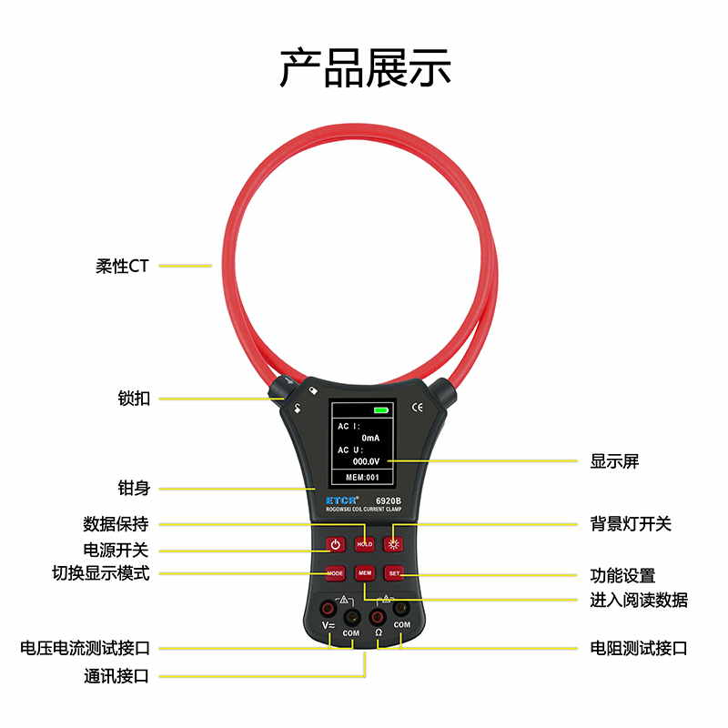 ETCR6920B柔性電流鉗表又名柔性線圈鉗表、超大電流鉗表、羅氏線圈電流鉗表、洛氏線圈電流鉗表,用于交流電流測試、電壓測試、電阻測試、通斷測試。柔性線圈無任何裸露金屬導(dǎo)體,體積小、重量輕、柔軟靈活,特別適合大尺寸導(dǎo)體、狹窄環(huán)境和排線密集的場所,可用于信號嚴(yán)重畸變的工業(yè)環(huán)境電流測試。廣泛適用于電力、通信、氣象、鐵路、油田、建筑、計(jì)量、科研教學(xué)單位、工礦企業(yè)等領(lǐng)域。