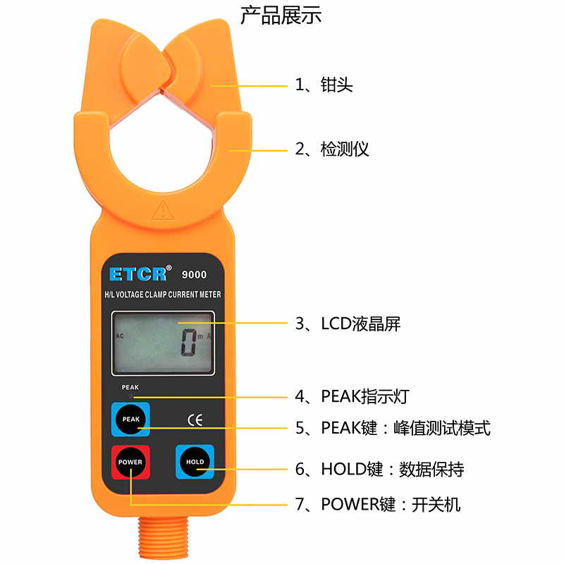 ETCR9000高低壓鉗形電流表鉗頭與引導(dǎo)區(qū)創(chuàng)新的一體化設(shè)計(jì),通過(guò)按壓或退拔絕緣桿能快速方便鉗夾或撤離被測(cè)導(dǎo)線,安全快捷。儀表還具有峰值保持、數(shù)據(jù)保持、數(shù)據(jù)存儲(chǔ)等功能。