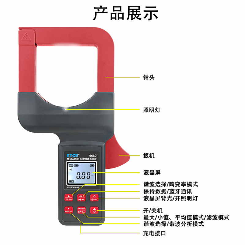ETCR6680鉗形漏電流表可測試40Hz~1kHz頻率范圍的電流。鉗表還具有背光、手電筒、數(shù)據(jù)存儲、藍牙通訊等功能。鉗表使用大容量鋰電池type-c充電口,是一款新型的電工安全檢測必備工具。