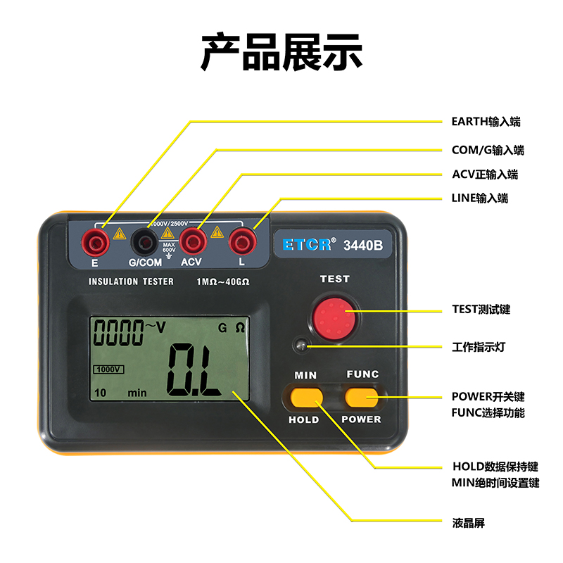 | ETCR3440B絕緣電阻表 | 500V、1000V、2500V | 0.5MΩ~40GΩ | 1mA MAX | AC:0V~600V |
