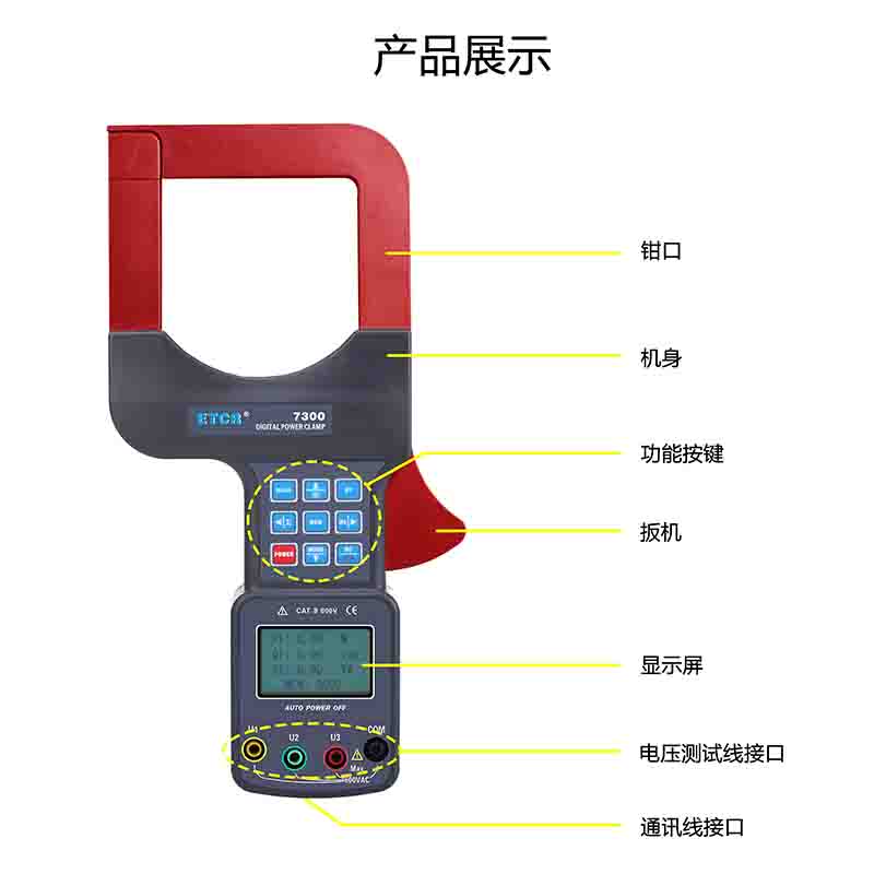 ETCR7300大口徑三相鉗形功率表又名鉗形功率計、超大口徑鉗形功率表、三相鉗形功率表,用于現(xiàn)場測量三相交流電壓、電流、漏電流、電壓間相位、電壓電流間相位、頻率、相序、電能、有功功率、無功功率、視在功率、功率因數(shù)、總功率等電能參數(shù)。還能用于判別變壓器接線組別、感性、容性電路,讀出差動保護各組CT之間的相位關(guān)系,檢查電度表的接線正確與否,檢修線路設(shè)備等,為用電檢查人員提供一種安全、準(zhǔn)確、便捷的新型電力儀表。