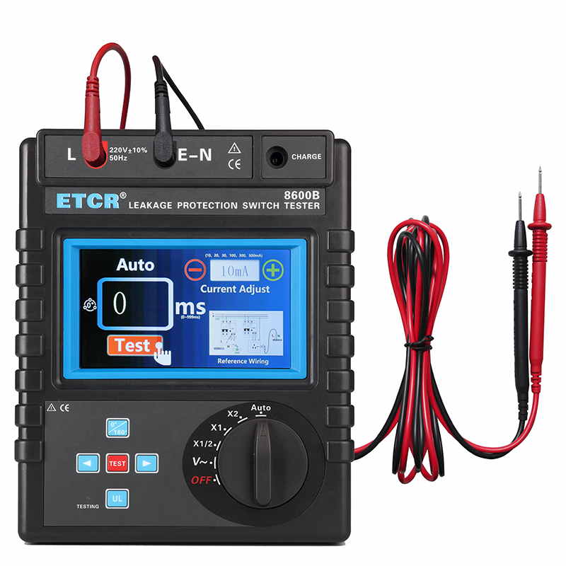 | ETCR8600B漏電保護器測試儀 | 5mA~1000mA,十六檔 | 0ms~999ms | AC 0~600V | 觸摸彩屏 | 鋰電池 |