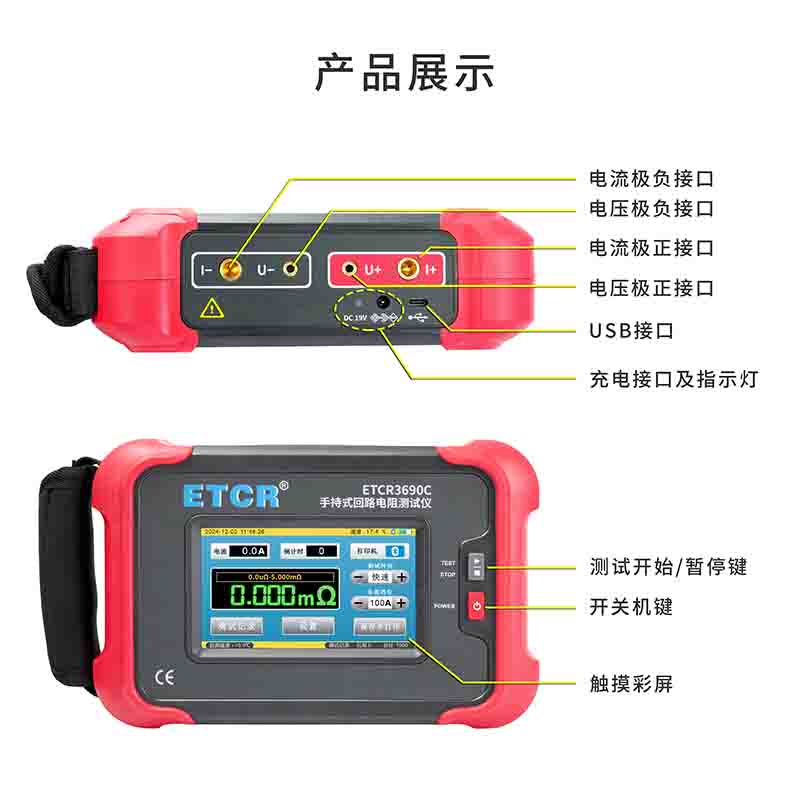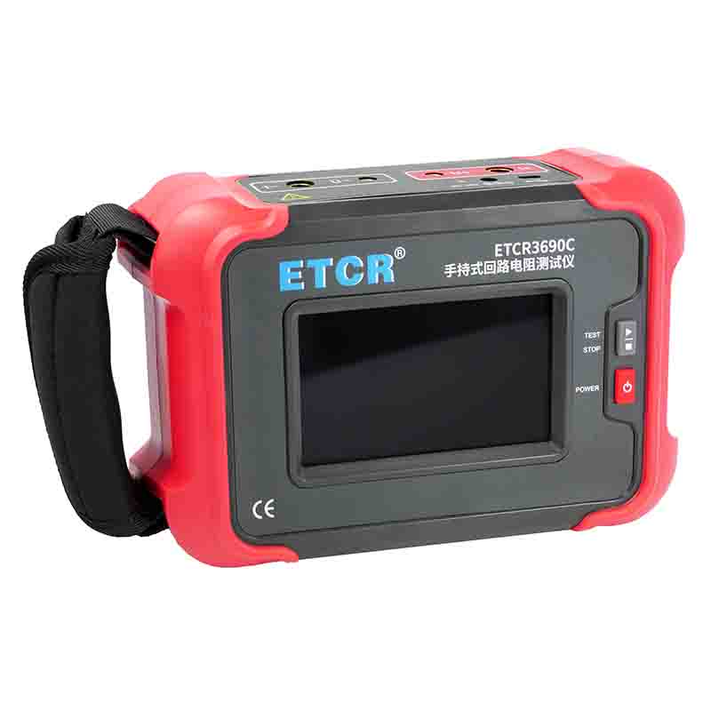 ETCR3690C手持式回路電阻測試儀根據(jù)人體工程學(xué)原理設(shè)計,手感舒適,特殊設(shè)計的機體結(jié)構(gòu)具有絕緣、封閉,防漏電、防風(fēng)沙,減震防護等功能。儀表采用高亮度5寸觸摸彩屏,操作簡易快速功能直達,字符清晰明亮,中英文顯示界面。儀表有多檔測試電流可選,儀表顯示當前檔位的測試范圍,用戶可自行選擇電流檔位及測試時間,滿足用戶不同場合的要求。