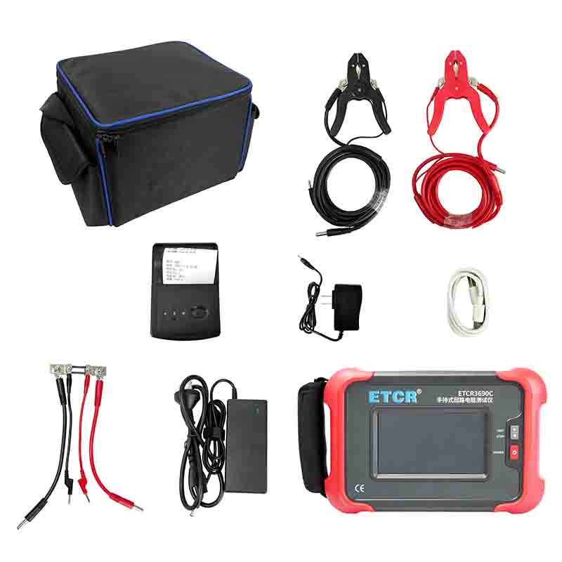 ETCR3690C手持式回路電阻測試儀由主機、監(jiān)控軟件、測試線、電源適配器、USB通訊線等組成。儀表可存儲測試1000組數(shù)據(jù),用戶可通過藍牙通訊讀取數(shù)據(jù)記錄,也可通過USB接口及上位機軟件將數(shù)據(jù)記錄上傳電腦,進行歷史數(shù)據(jù)讀取、查閱、保存等功能。儀表配置熱敏式打印機,可在現(xiàn)場打印測試結(jié)果。
