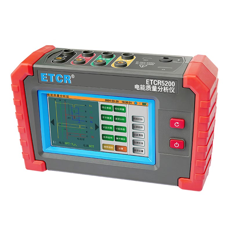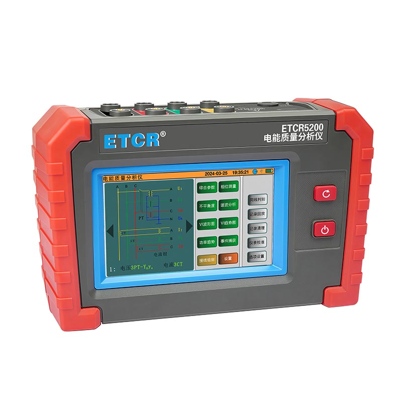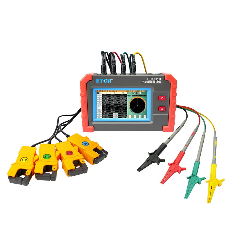 ETCR5200迷你型電能質(zhì)量分析儀又稱電力質(zhì)量分析儀、電力參數(shù)測試儀、諧波分析儀,是一款專為現(xiàn)場測試三相電能質(zhì)量的高精度綜合型測試儀器。儀表具有智能化、功能完善、人機(jī)操作簡潔、中英文雙語操作界面等特點(diǎn)。儀表采用5寸觸摸彩屏、體積小重量輕、攜帶方便,可選配多款電流鉗。儀表可同時測量4路電流(ABC三相及中性線電流),3路電壓、三相不平衡度、有功功率、無功功率、視在功率、諧波比、總諧波失真度等;顯示電流電壓的實(shí)時波形、相量圖;動態(tài)捕捉電壓電流瞬時變化,監(jiān)測啟動電流,監(jiān)測各電力參數(shù)并生成告警列表,長時間記錄測試數(shù)據(jù)并生成趨勢曲線圖等功能。適用于電力、石化、冶金、鐵路、工礦企業(yè)、科研院校、計(jì)量部門等。