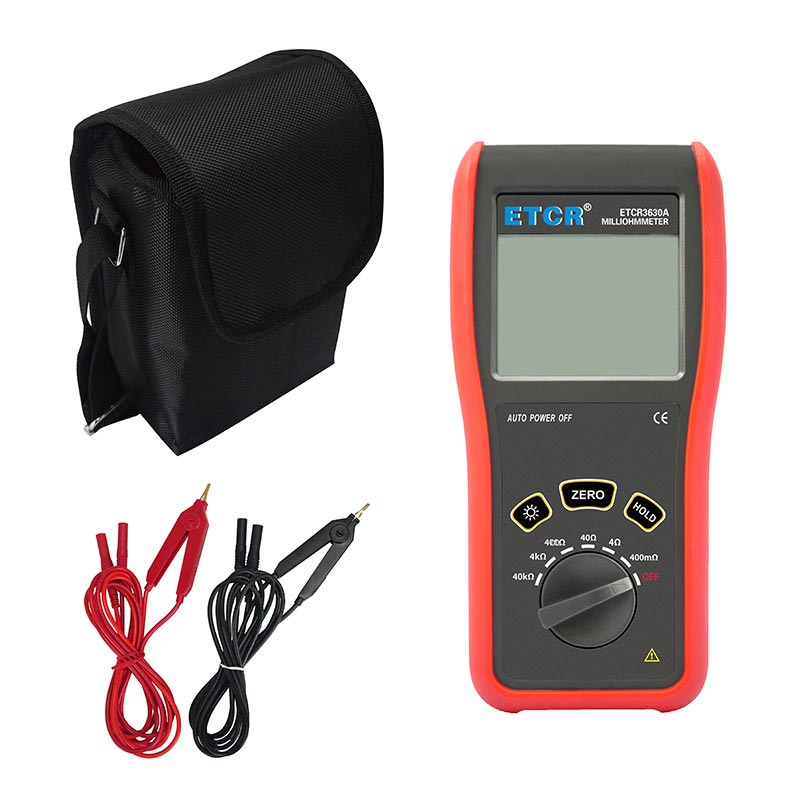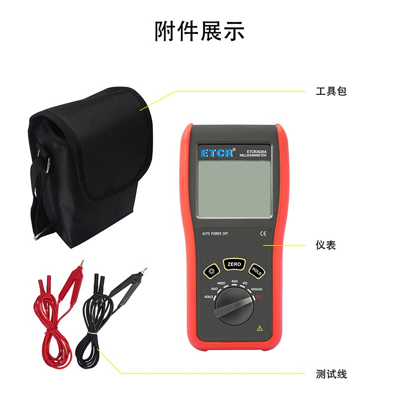 ETCR3630A便攜式毫歐計(jì)又稱直流低電阻計(jì)、直流電阻測試儀,歐姆計(jì),儀表采用微處理機(jī)技術(shù),四線法測試,安全精密可靠。主要用于測量電纜的導(dǎo)線電阻,開關(guān)、接插件、繼電器的接觸電阻,線圈、電動機(jī)、變壓器繞組的直流低電阻,金屬鉚接件金屬構(gòu)件之間,地網(wǎng)地極連接導(dǎo)體間的聯(lián)接電阻。儀表廣泛應(yīng)用于工礦企業(yè)、建筑監(jiān)測監(jiān)理公司、建筑施工單位、防雷公司、電力部門、船舶機(jī)車廠等。ETCR3630A便攜式毫歐計(jì)由主機(jī)、測試線組成。主機(jī)大屏LCD顯示,一目了然。能存儲1000組數(shù)據(jù),電阻測量范圍:0.1mΩ~40.0kΩ,最大測試電流:100mA,儀表操作簡易,攜帶方便。