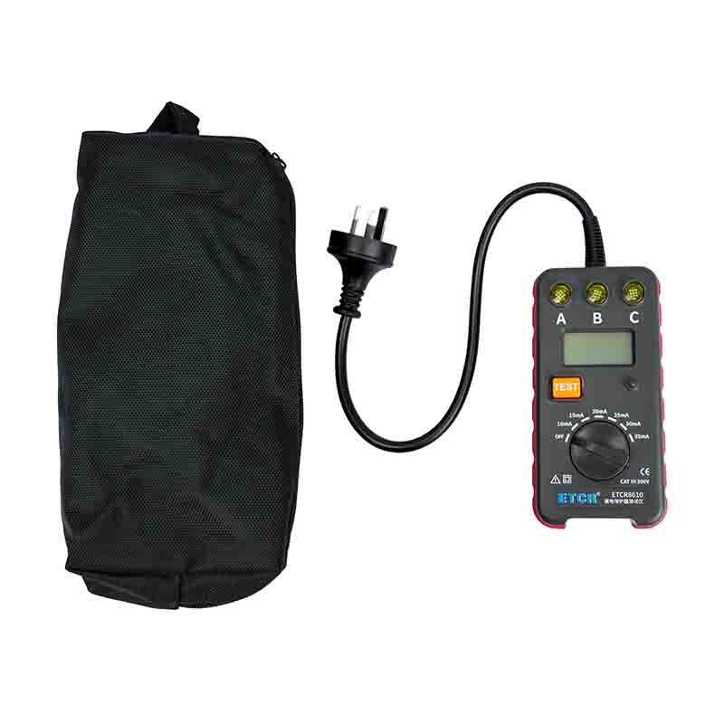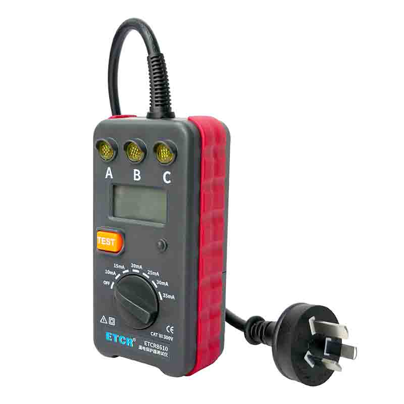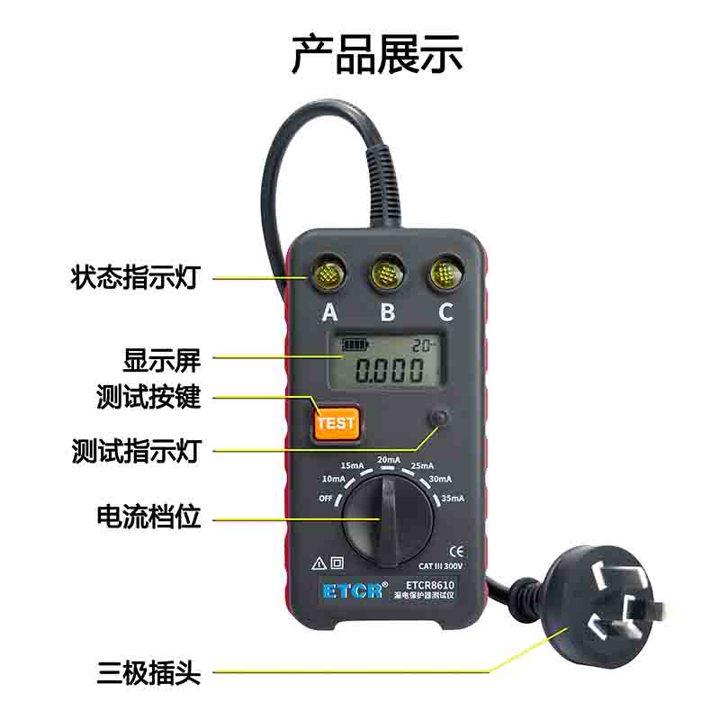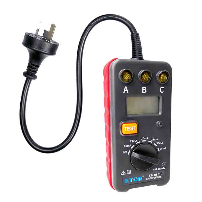 ETCR8610插座式漏電保護(hù)器測(cè)試儀專為現(xiàn)場(chǎng)檢查三極插座工作狀態(tài)同時(shí)測(cè)試漏電保護(hù)器的漏電動(dòng)作時(shí)間,測(cè)試電流從10~35mA分6檔(10mA、15mA、20mA、25mA、30mA、35mA),測(cè)試漏電流動(dòng)作時(shí)間量程為0.001s~1.000s。測(cè)試時(shí),將儀表的三極插頭插入三極插座。儀表的指示燈A、B、C顯示插座工作狀態(tài)及接線是否正確,測(cè)試漏電流動(dòng)作時(shí)間。儀表便攜式設(shè)計(jì),體積小、重量輕、外觀精致,便于攜帶,是各種漏電保護(hù)器現(xiàn)場(chǎng)或室內(nèi)檢測(cè)的理想工具。