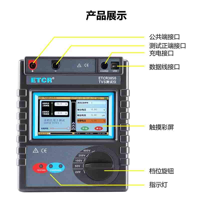 1、TVS測試儀,采用觸摸彩屏,具有電壓閾值輸入、合格判定、測試結(jié)果顯示、實時電壓電流顯示、測量記錄使用情況、電池電量顯示、測試記錄顯示及測試記錄操作。