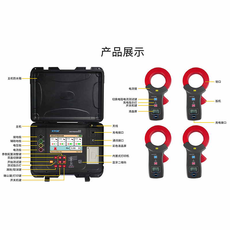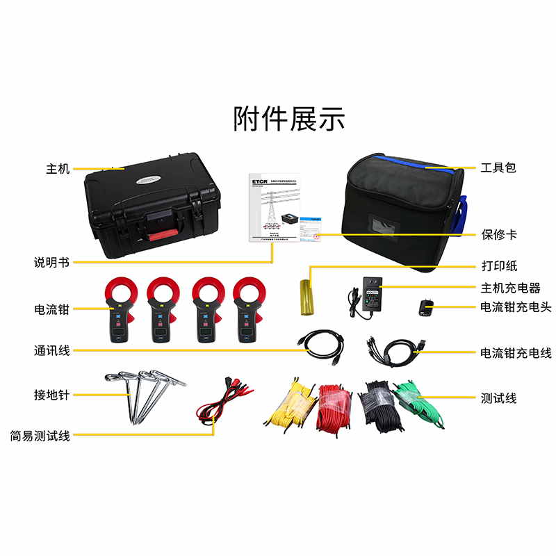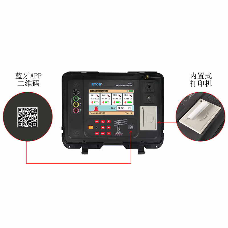 ETCR3250免解扣桿塔接地電阻測(cè)試儀由主機(jī)、4個(gè)電流鉗、測(cè)試線、輔助接地棒、通訊線、打印機(jī)等組成。主機(jī)采用7寸彩屏,電流鉗與主機(jī)采用無線通訊,儀表還具有藍(lán)牙通訊,下載APP后可在手機(jī)進(jìn)行測(cè)試及查看測(cè)試結(jié)果。儀表配有內(nèi)置式打印機(jī),可在現(xiàn)場(chǎng)打印測(cè)試結(jié)果。儀表能存儲(chǔ)100組數(shù)據(jù),通過USB接口及上位機(jī)軟件上傳測(cè)試結(jié)果,實(shí)現(xiàn)歷史數(shù)據(jù)讀取、查閱、保存、報(bào)表、打印等功能。儀表外殼采用防水保護(hù)箱,防撞、防摔、防水(防護(hù)等級(jí)IP65)堅(jiān)固安全耐用,儀表還配有大容量可充電鋰電池組,特別適合在戶外工地使用。