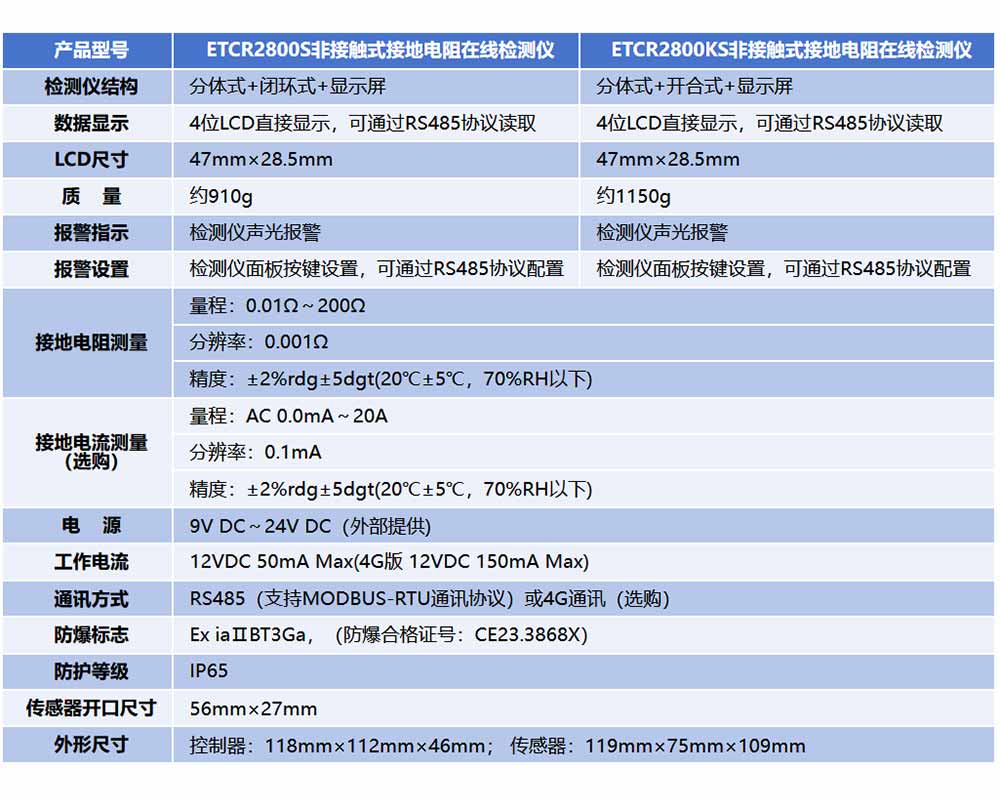 ETCR2800系列接地電阻在線檢測(cè)儀用于在線監(jiān)測(cè)接地電阻、接地引下線的連接狀況、回路接地電阻、金屬回路聯(lián)結(jié)電阻,還可以在線監(jiān)測(cè)接地電流。又稱接地電阻在線測(cè)試儀、回路電阻在線監(jiān)測(cè)儀。檢測(cè)儀采用非接觸測(cè)量技術(shù)、地線穿心通過(guò)傳感器、絕不影響防雷接地效果和設(shè)施的正常運(yùn)行;檢測(cè)儀有多種結(jié)構(gòu)適應(yīng)不同場(chǎng)所使用;檢測(cè)儀防護(hù)等級(jí)IP65,可在戶外安裝使用。