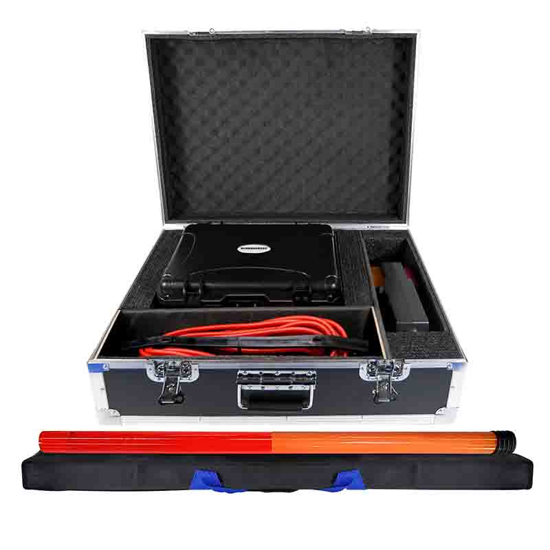 ETCR1400架空線路接地故障巡查儀又稱二分法架空線路接地故障查找儀、 架空線路單相接地故障定位儀、小電流接地故障定位儀、配網(wǎng)專用架空線路故障定位儀,儀器由主機、檢測鉗、測試線、接地針、絕緣桿及附件組成,主機與檢測鉗間采用無線通訊。主機采用7寸彩屏,故障指向清晰明了,測試結(jié)果一目了然,主機具有語音播報功能,語音提示線路故障方向,使得現(xiàn)場操作更加輕松。創(chuàng)新的檢測鉗集信號發(fā)射、采集于一體,鉗形結(jié)構(gòu),體積小,重量輕,掛裝方便,一次掛裝即可完成線路故障查找,操作簡易快速,極大減輕了測試的工作強度,提高工作效率。檢測鉗自帶非接觸驗電器,能檢驗電纜線是否帶電,并發(fā)出聲光報警,確保操作人員和設(shè)備的安全。儀器還具有藍牙通訊功能,USB通訊接口。