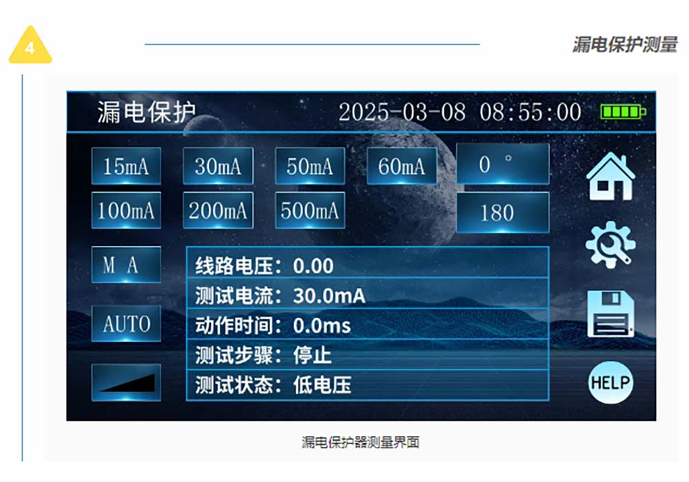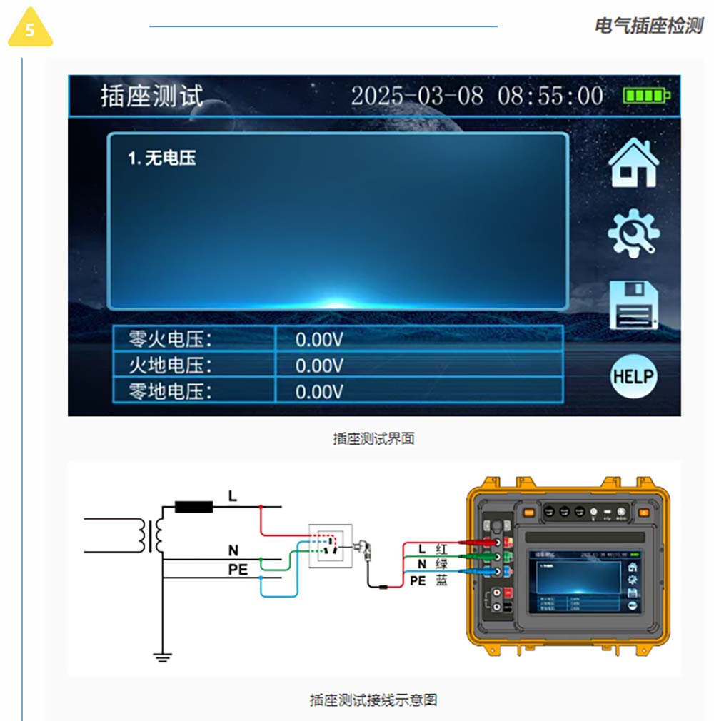 接地/絕緣/直流電阻測試、RCD漏電保護(hù)檢測、電氣插座檢測、電流有效值測試、交流電壓測試、相序測試等電力參數(shù)測試。